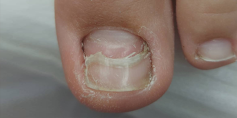 Она отделяется не от свободного края, как при онихолизисе, а от ложа у основания ногтя, где расположена зона роста, то есть с проксимального края.