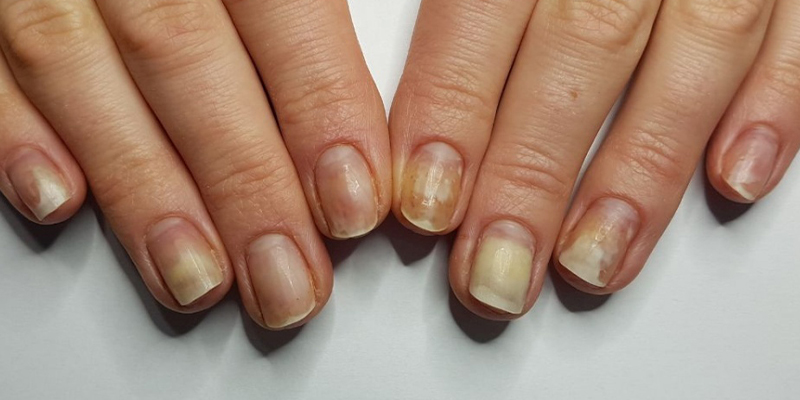 Инфекционные причины появления онихолизиса приводят к изменению цвета и структуры ногтевой пластинки. При грибковом поражении ногти приобретают желтый, коричневый или синий цвет. При поражении синегнойной палочкой или плесневыми грибами – зеленый.